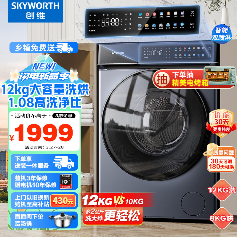 创维SKYWORTH)12公斤滚筒洗衣机全自动洗烘一体机变频低噪超薄家用大容量空气洗彩屏触控XQG120-B61GDH价格:1999.00元!