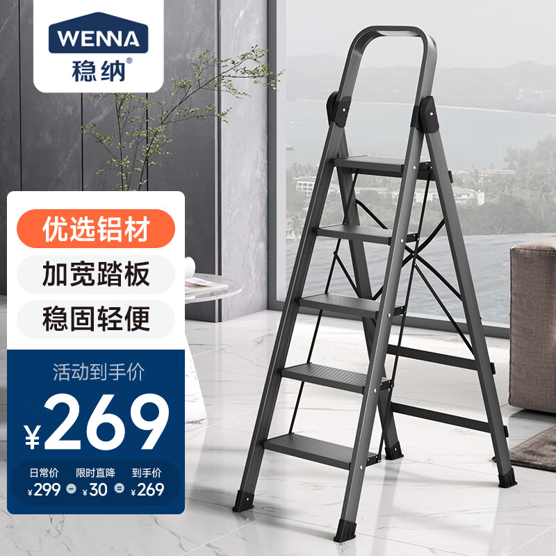 稳纳梯子家用五步折叠梯登高加厚铝合金加固铝梯人字梯工程梯6225S价格:299.00元!
