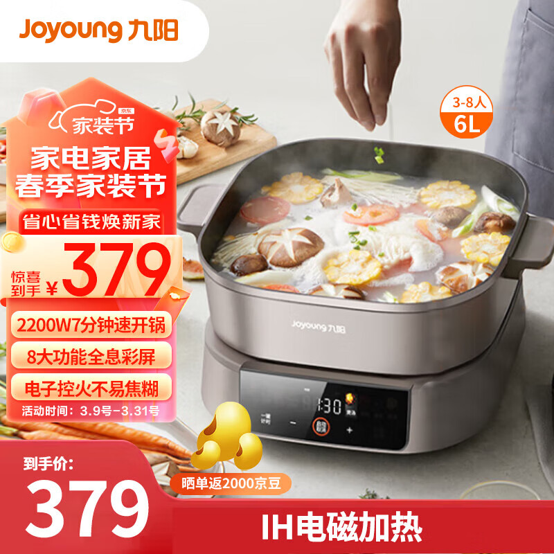 九阳(Joyoung)电火锅IH秒涮电磁加热2200W大火力电热锅多功能锅6L烤涮分体式电炒锅电煮锅全息触控大彩屏HG60-G2价格:379.00元!