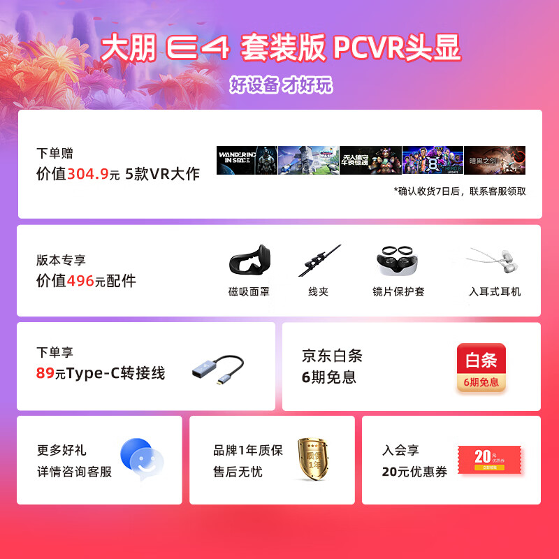 大朋E4套装版 PCVR头显 智能眼镜 万款Steam游戏 平替Vision pro 3D观影日韩欧美大片 非AR 一体机 价格:3999.00元!