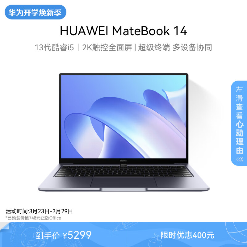 华为MateBook 14笔记本电脑 13代酷睿/2K触控屏/14英寸轻薄办公本/超级终端 i5 16G 1T 深空灰价格:5299.00元!