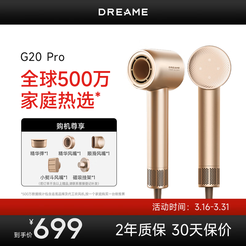追觅韶光G20Pro高速吹风机家用 大功率负离子吹风筒 精华弹护发润发电吹风节日礼物 香槟金价格:749.00元!