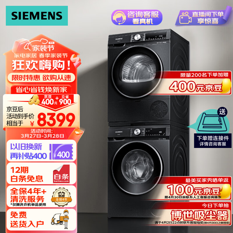 西门子(SIEMENS)iQ300曜石黑系列洗烘套装 10kg 智能除渍 滚筒洗衣机全自动+10kg 羽绒服烘 热泵烘干机 U20W+D20W价格:9699.00元!