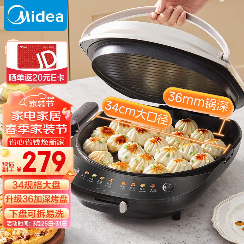 美的(Midea)电饼铛家用大尺寸下盘可拆洗三明治机早餐机煎饼锅蒸汽加大加深双面加热独立控温烙饼锅电饼档3458价格:279.00元!