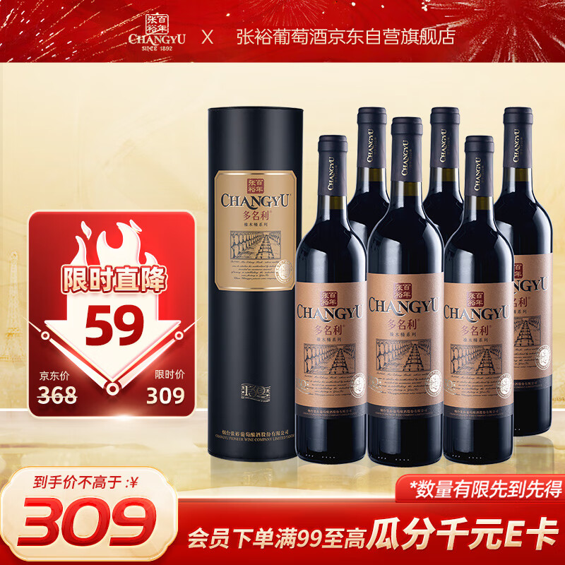 张裕 特选级赤霞珠干红葡萄酒750ml*6瓶整箱国产红酒(新老包装)送礼价格:309.00元!