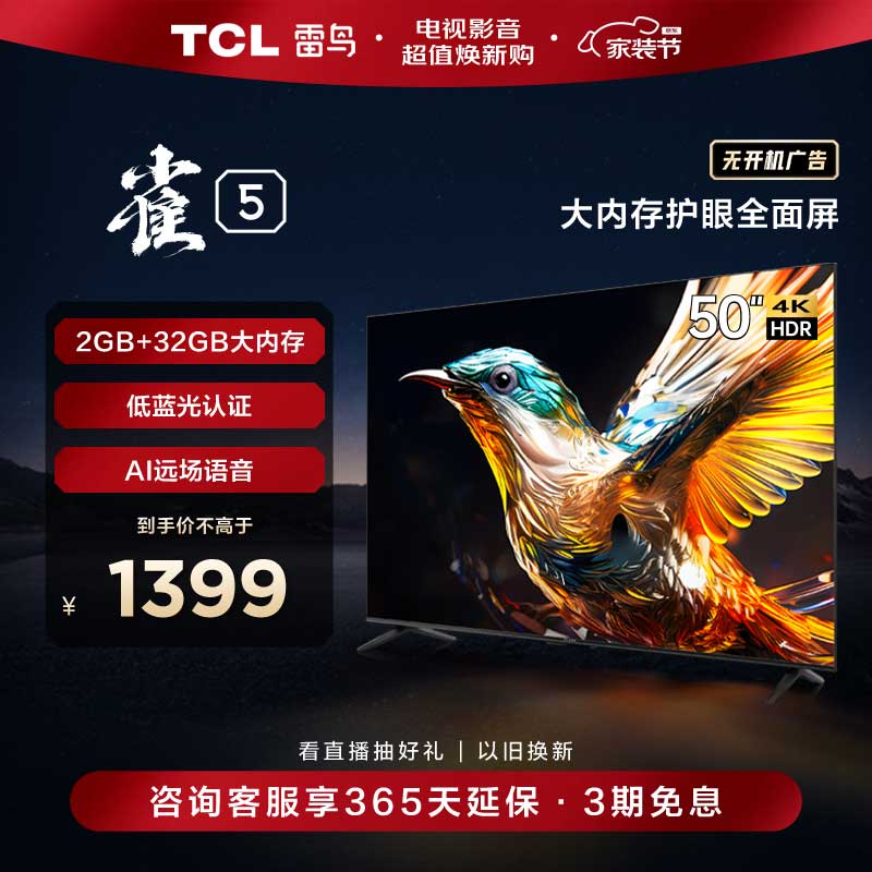 TCL雷鸟 雀5 50英寸电视 4K超高清 护眼防蓝光 超薄屏 2+32GB 游戏智能液晶平板电视机50F275C价格:1399.00元!