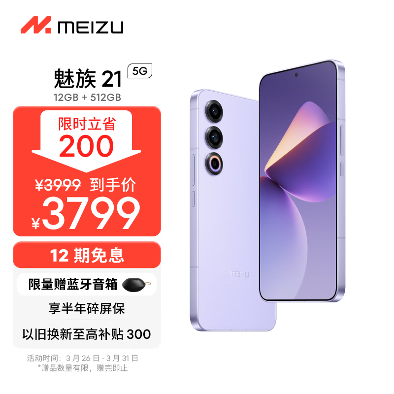 魅族(MEIZU)21 12GB+512GB 灵动紫 1.74mm极窄四等边直屏 骁龙8Gen3 2亿像素 80W超充 5G游戏学生拍照手机价格:3799.00元!