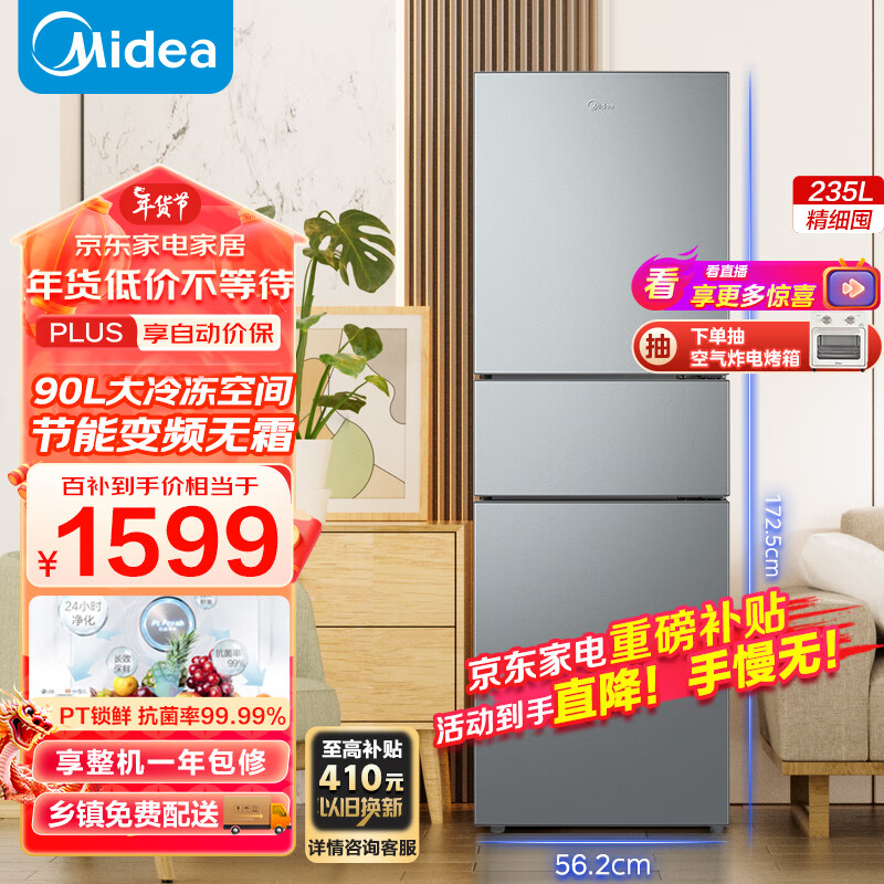 美的(Midea)235升三门家用小型冰箱三开门风冷无霜变频节能省电净味保鲜租房不占地电冰箱BCD-235WTPM(E)价格:1899.00元!