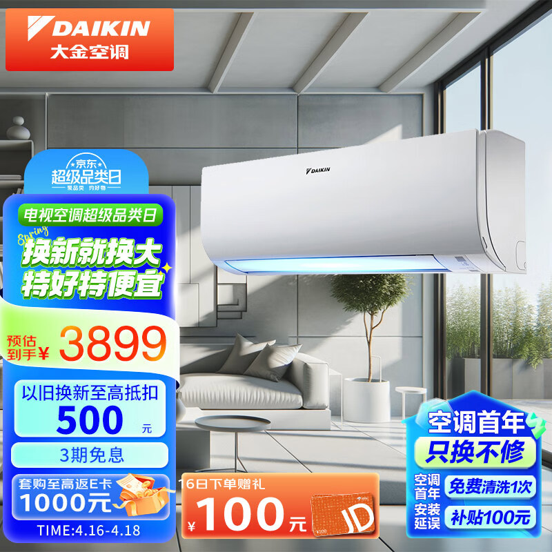 大金空调 14-19㎡适用 新三级能效 大1.5匹 变频 冷暖 家用 壁挂式 以旧换新 FTXJ336WC-W价格:3896.00元!