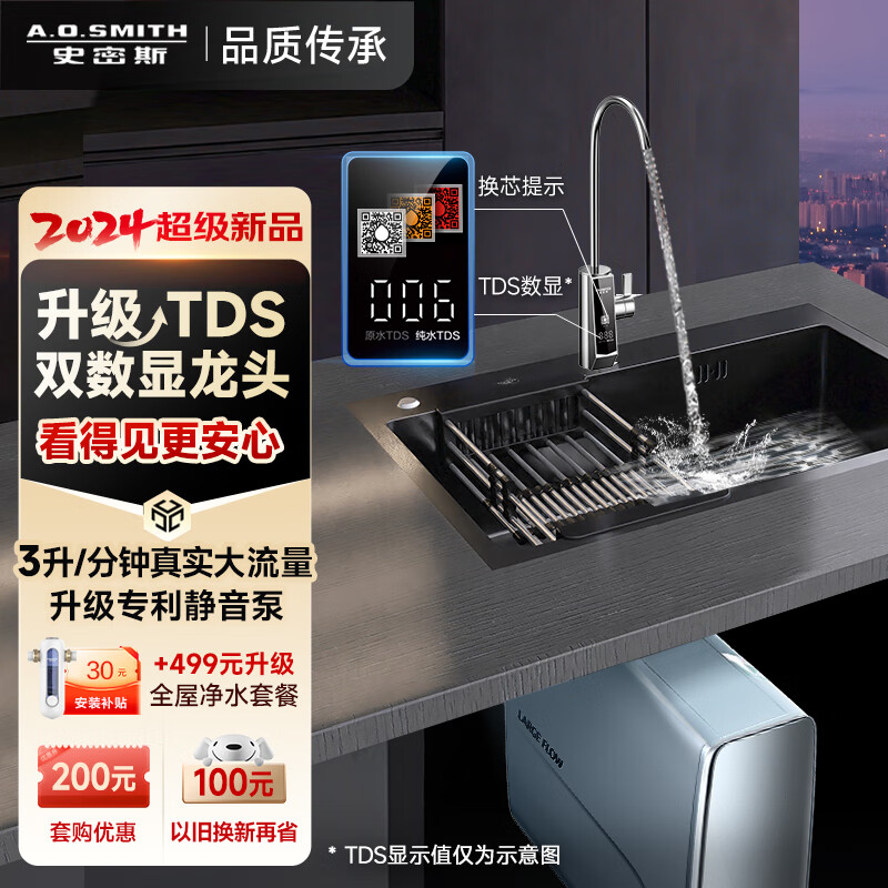 史密斯(A.O.SMITH)佳尼特净水器蓝鲸3000家用厨下式直饮净水机反渗透3升/分钟升级TDS双数显龙头0陈水CR3000AB1价格:3899.00元!
