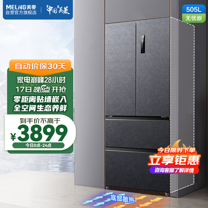 美菱(MeiLing)【无忧嵌】505升法式多门家用变频一级能效大容量风冷无霜净味冰箱超薄零嵌入式BCD-505WPU9CX灰价格:3899.00元!