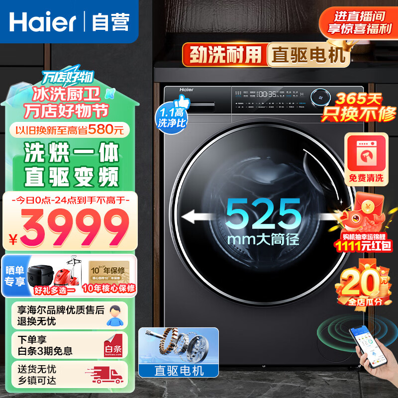 海尔(Haier)洗衣机10KG直驱变频全自动滚筒1.1洗净比洗烘一体香薰护衣纤薄机身525mm大筒径WIFI智能投放价格:3899.00元!