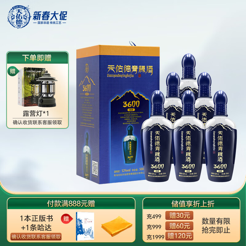 天佑德 海拔3600 清香型白酒 52度 500ml*6瓶 整箱装【青海青稞酒】价格:1288.00元!
