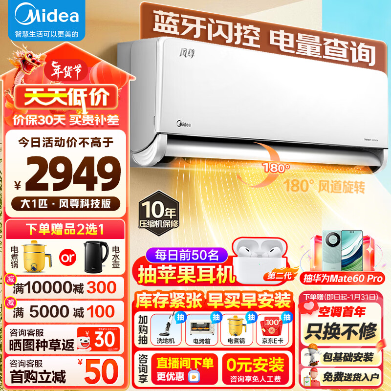 美的(Midea)空调1.5匹挂机 风尊科技版 新一级能效 变频冷暖 电量查询 壁挂式 KFR-35GW/N8MXC1 卧室书房空调价格:2949.00元!