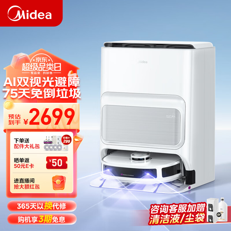 美的(Midea)扫地机器人扫拖一体 灵眸V12极地白 自动集尘扫拖洗烘一体机自动清洗拖布洗地机拖地机价格:2699.00元!