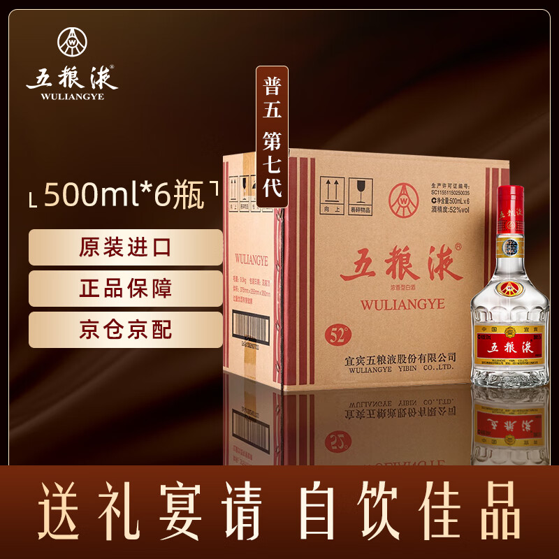 五粮液 普五 第七代 浓香型白酒 52度 500ml*6瓶整箱 商务宴请 海外版价格:5502.00元!