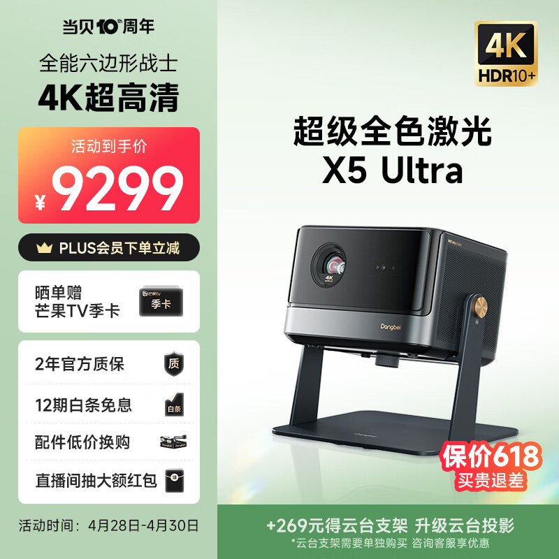 当贝 X5Ultra 超级全色激光 4K 投影仪家用 X5U游戏投影机 (2500 CVIA流明 MT9679大师芯片 6+128G)价格:9299.00元!
