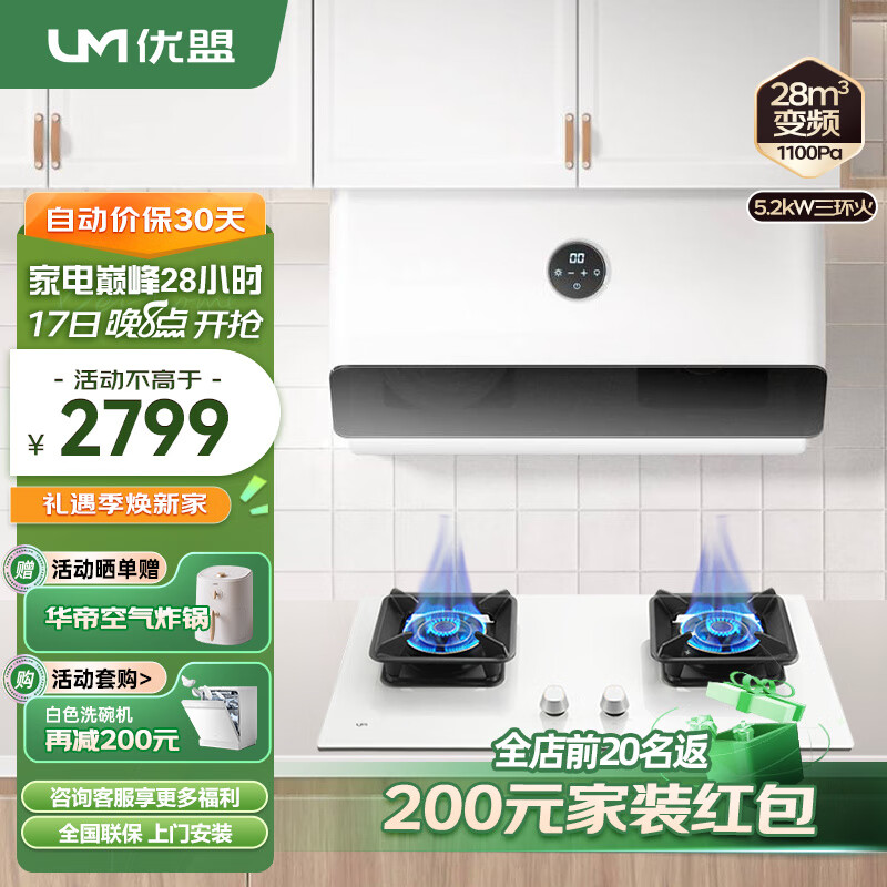 优盟(UM)抽油烟机白色超薄近吸烟机80cm小尺寸28风量家用变频油烟机燃气灶烟灶套装自动清洗 天然气价格:2799.00元!