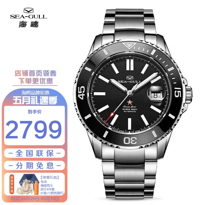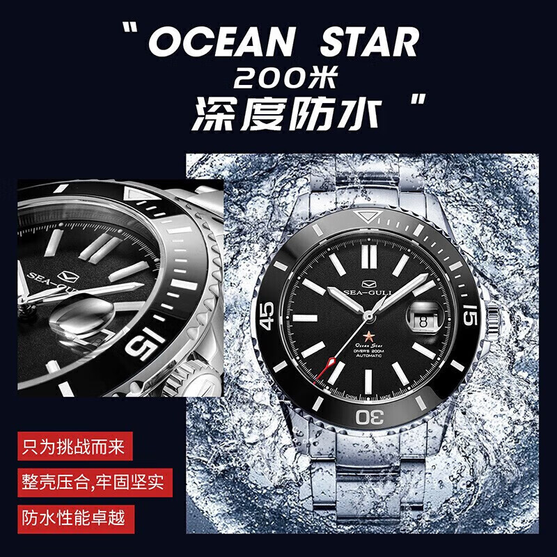 海鸥(SEAGULL)手表男士自动机械表 男表礼物 日历夜光200米防水陶瓷圈潜水腕表价格:3199.00元!