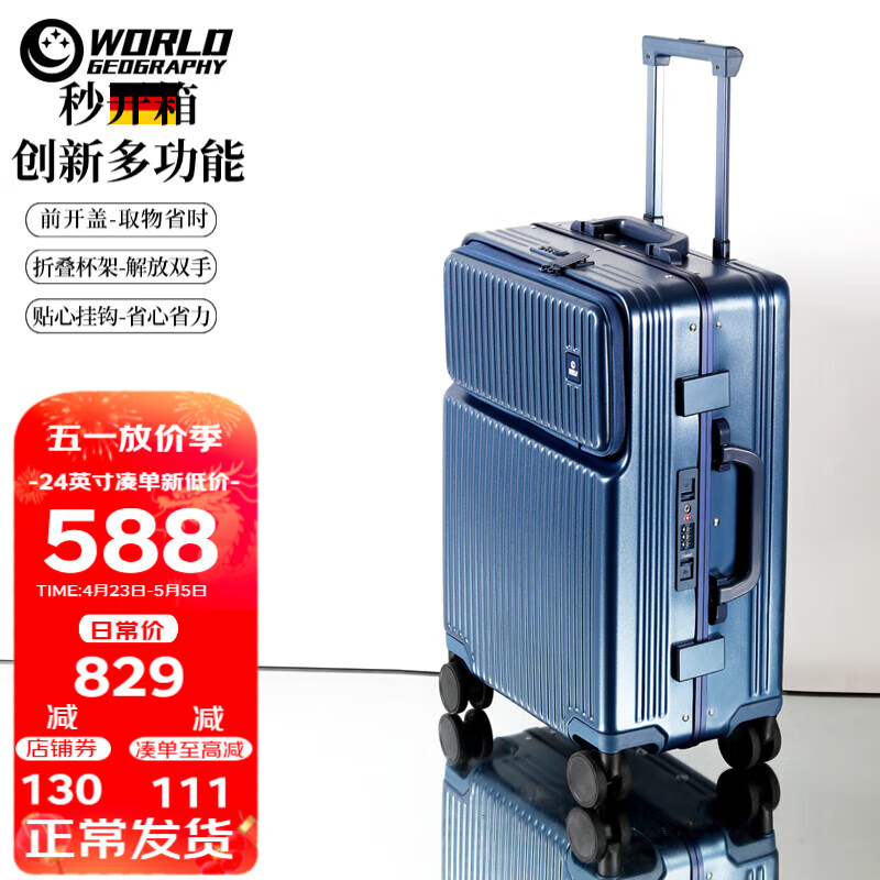 地理德国前开盖行李箱男女铝框拉杆箱密码旅行箱24英寸托运箱 星河蓝价格:829.00元!