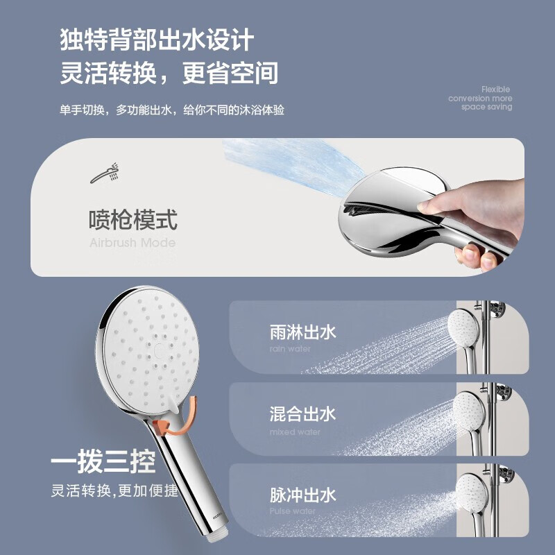 出水方式:顶喷,手持花洒,龙头