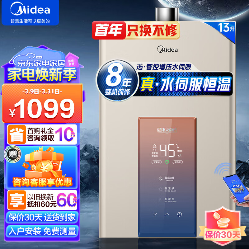 美的(Midea)13升燃气热水器天然气水量伺服智能恒温增压WIFI智控多处用水零干扰JSQ25-MK3价格:1099.00元!