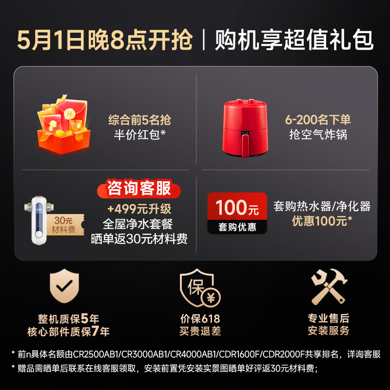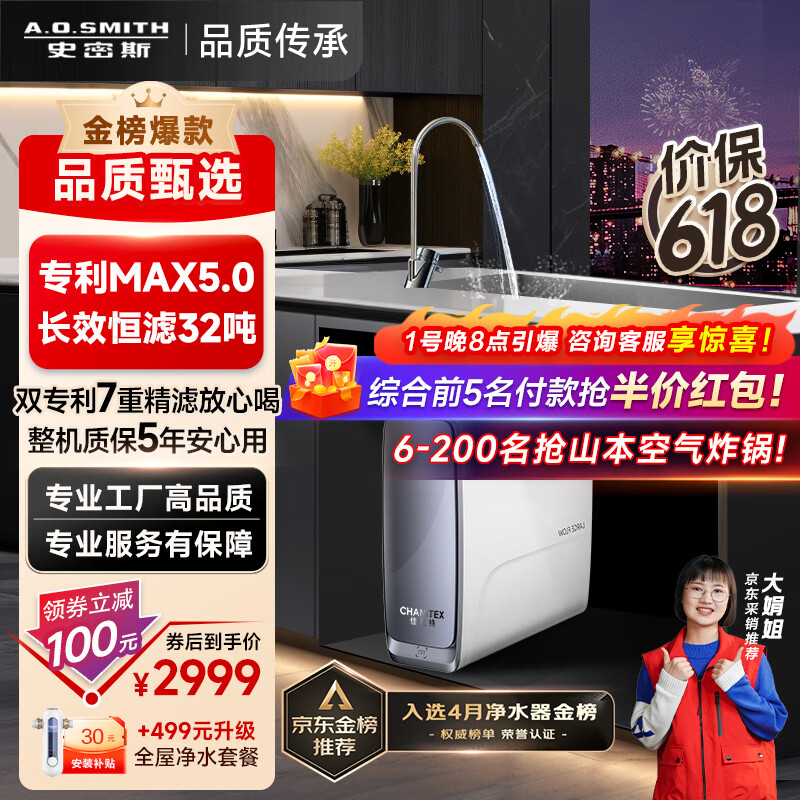 史密斯(A.O.SMITH)佳尼特蓝鲸净水器家用厨下式直饮净水机2.5升/分钟专利MAX5.0反渗透 0陈水 CR2500AB1价格:3598.00元!