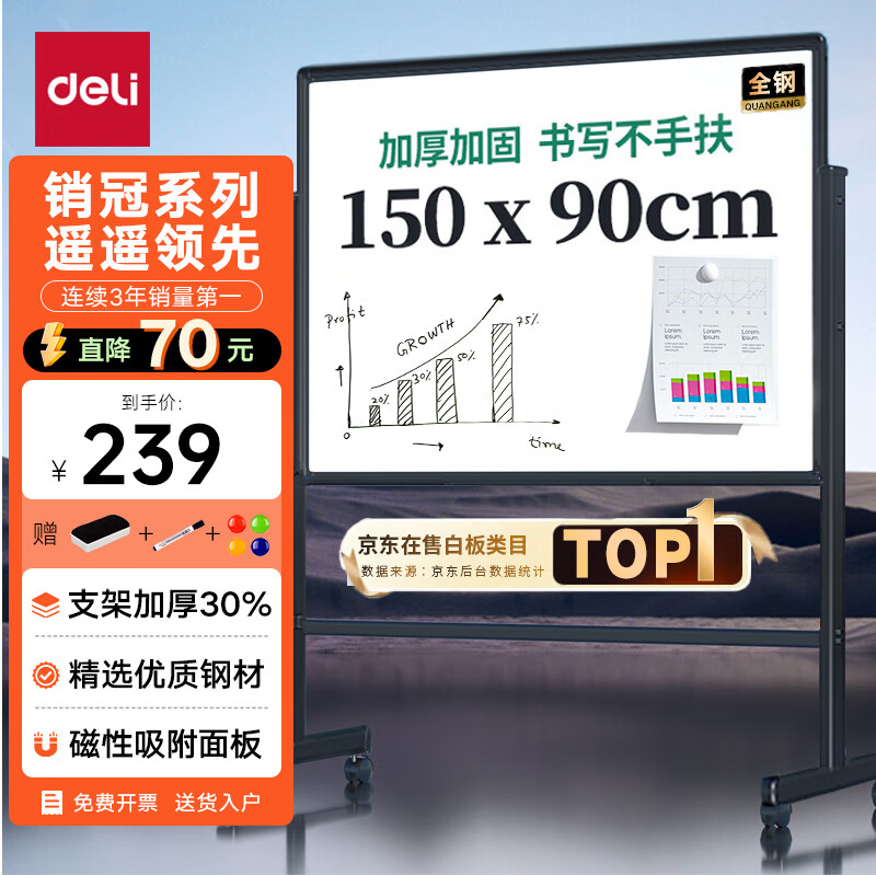 得力150*90cmH型支架式白板写字板 书写移动升降教学儿童画板黑板办公会议黑板家用33726【销冠系列】价格:309.00元!