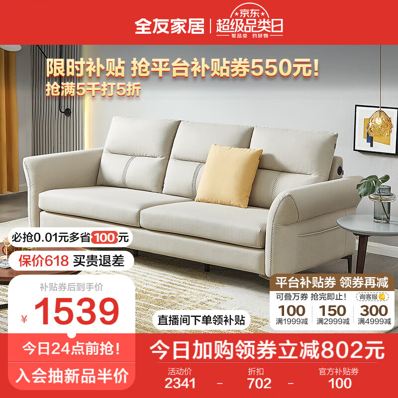 全友家居 现代简约功能科技布艺可拆洗储物三人位直排沙发客厅102679价格:2341.43元!