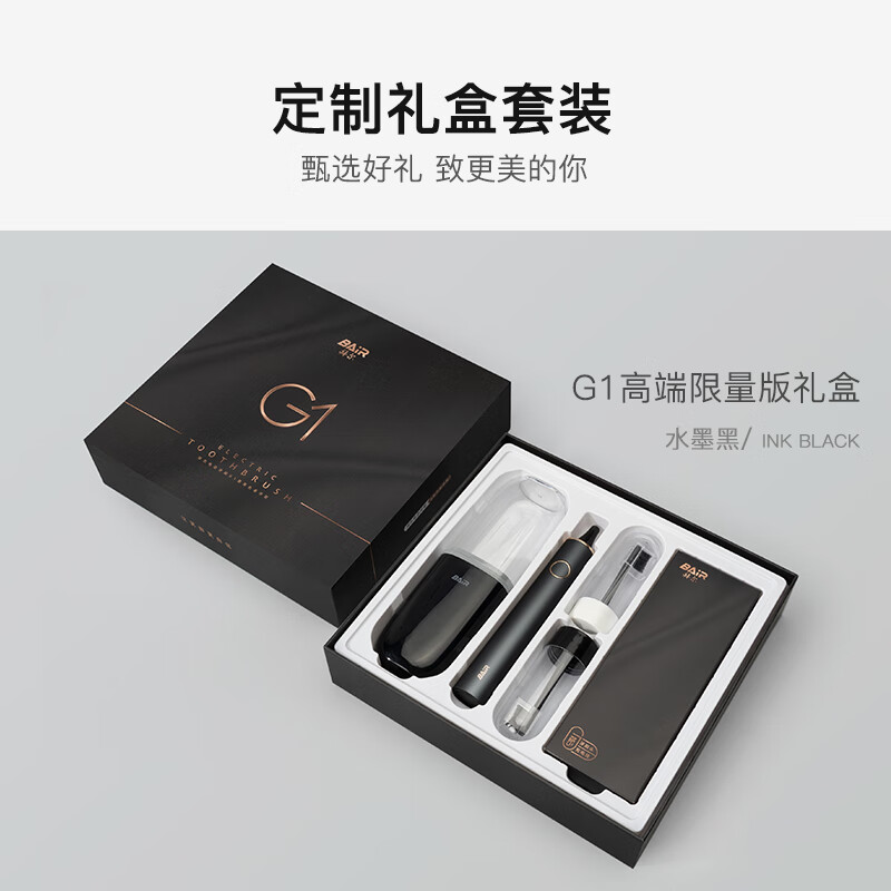 拜尔(BAIR) GI机皇豪华定制版 电动牙刷成人软毛充电式深度清洁智能声波男情侣套装男士送女朋友礼物 礼盒装 水墨黑单支装(下单共6枚原装刷头)价格:429.00元!