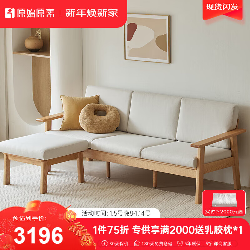 原始原素实木沙发 橡木冬夏两用小户型客厅 原木色--梨白色 三人位+脚踏价格:4262.00元!