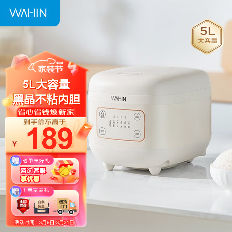美的(Midea)出品电饭煲电饭锅 家用4-10人智能预约多功能快速蒸饭锅 5L不粘内胆迷你煲汤煮粥米饭锅 WH-FB565R价格:189.00元!