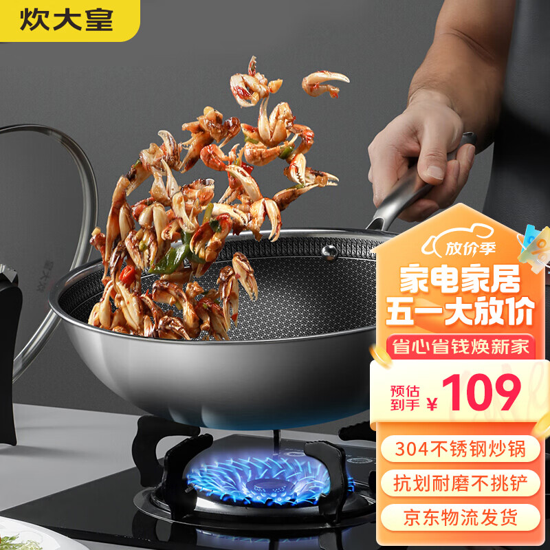 炊大皇 炒锅 304不锈钢炒菜锅煎锅 平底不粘炒锅32cm 可立可视盖不挑灶价格:139.00元!