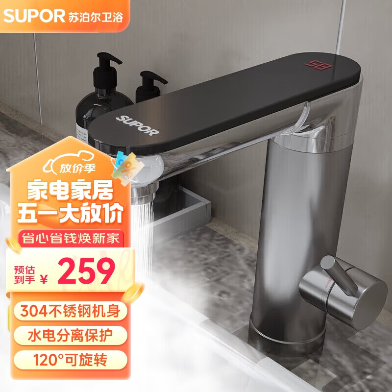 苏泊尔(SUPOR)电热水龙头不锈钢面盆龙头即热式加热速热家用厨房小厨宝带漏保价格:259.00元!
