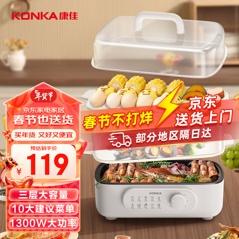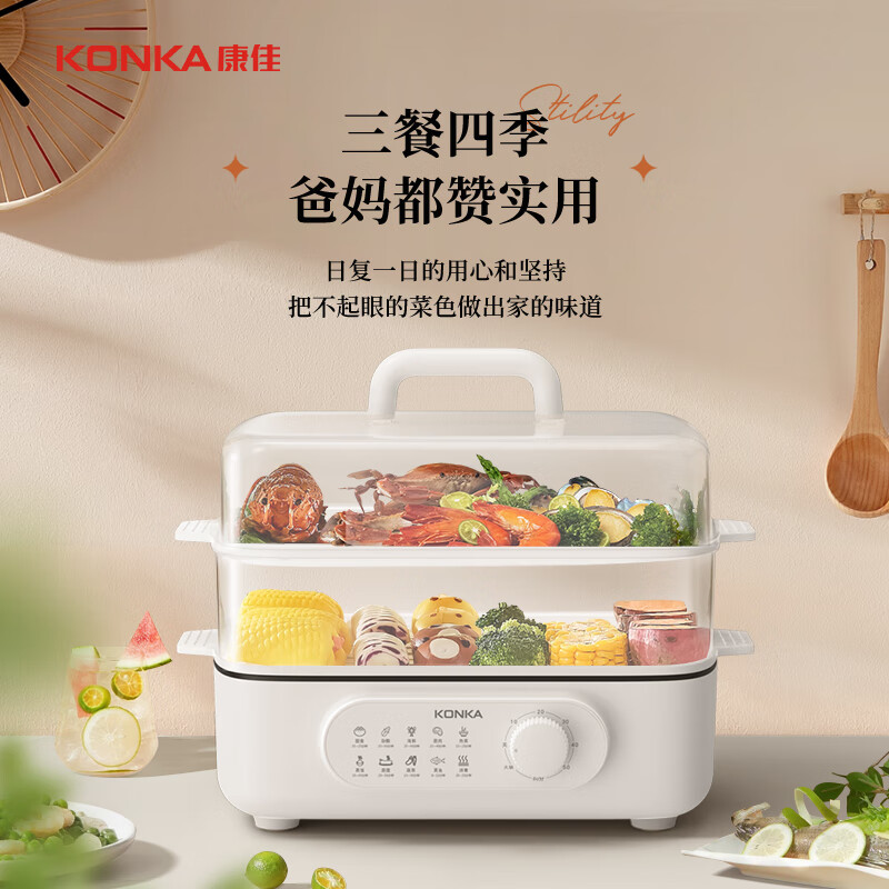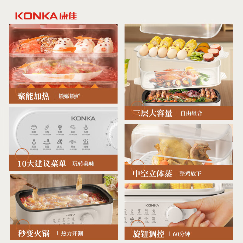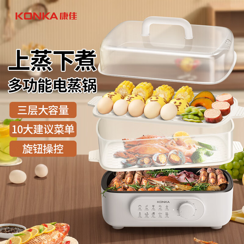 康佳(KONKA)电蒸锅 电煮锅 电火锅 多功能锅家用电锅蒸包子锅电热锅三层大容量多用途锅 KDZG-1313-W价格:119.00元!