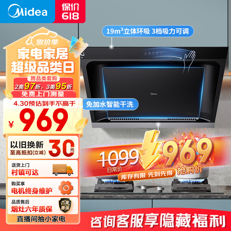 美的(Midea)抽油烟机 家用厨房侧吸式吸油烟机大吸力 自动清洗挥手智控 脱排油烟机JP32价格:969.00元!