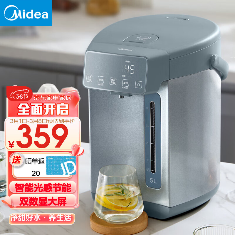 美的(Midea)电热水瓶烧水壶电热水壶恒温水壶5L大容量烧水一体机母婴级不锈钢内胆多段保温非即热式饮水机 304不锈钢光感节能电水瓶 5L价格:399.00元!