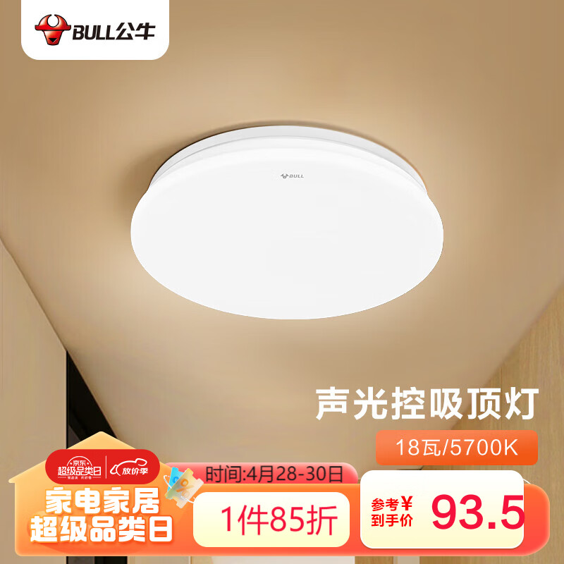 公牛(BULL)声光控感应吸顶灯MX-A018F-ES玄关卫生间门廊阳台现代简约灯具18W价格:110.00元!