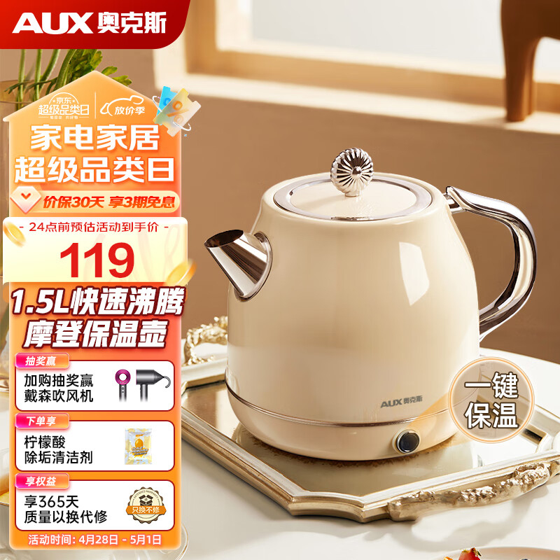奥克斯(AUX)电水壶 1.5L保温复古家用保温大容量烧水壶304不锈钢电热水壶自动煲水壶 AAS-15A1B06 典雅白 1.5L价格:159.00元!