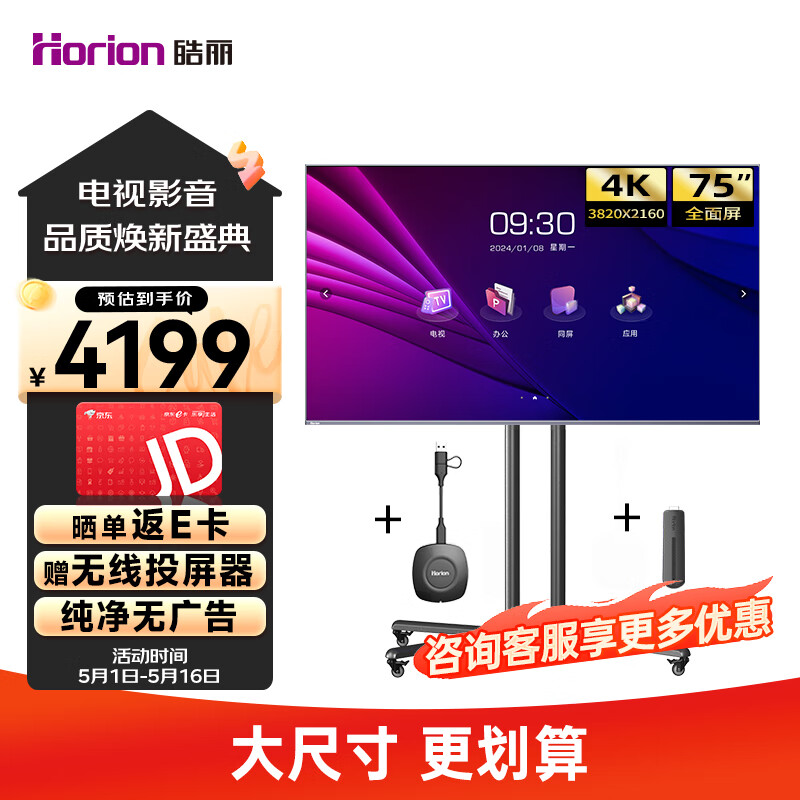 皓丽(Horion)会议平板电视一体机75英寸移动投影电视一体机智慧屏投屏商用显示会议室教学培训大屏75H5桌面底座价格:4299.00元!
