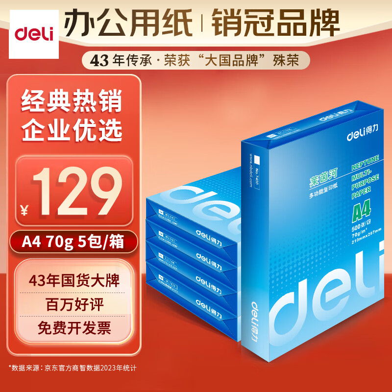 得力(deli)莱茵河A4打印纸 70g500张*5包一箱 口碑优选复印纸 双面草稿纸 整箱2500张7401【采购优选】价格:129.00元!