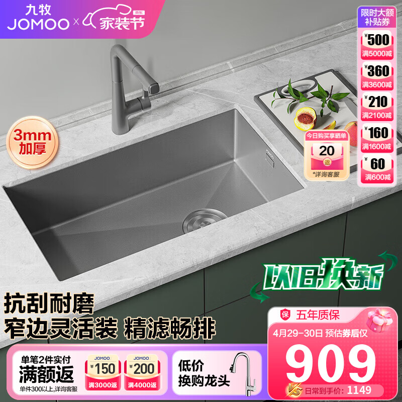 九牧(JOMOO)不锈钢手工枪灰水槽厨房洗菜盆大单槽68*45(不含龙头) 06251-AZ价格:1119.00元!