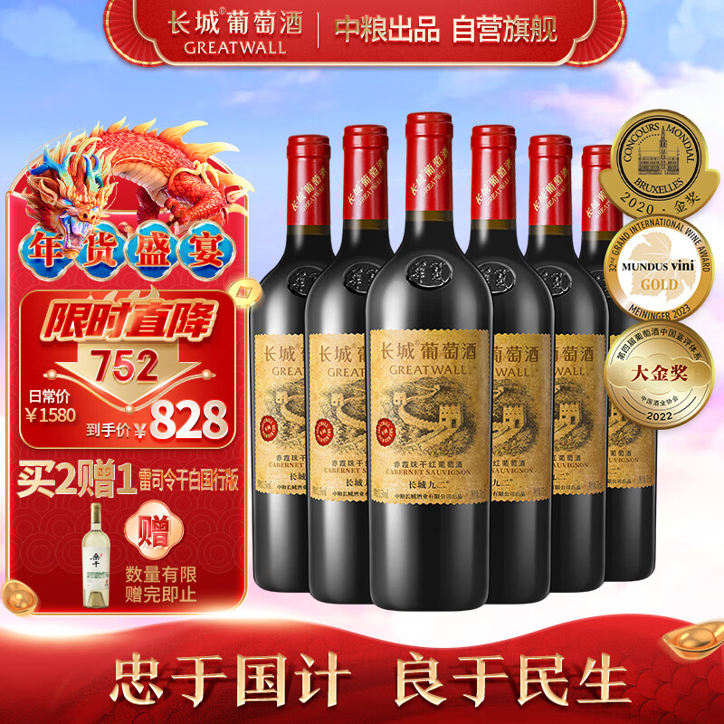 长城 华夏葡园 长城九二赤霞珠干红葡萄酒 750ml*6瓶 整箱装价格:828.00元!