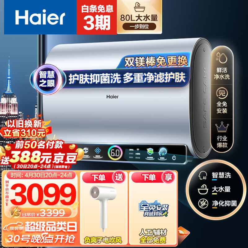 海尔(Haier)80升超薄扁桶双胆电热水器家用储水式隐藏安装双3000W速热双镁棒免换 EC8003-BOOKU1 【以旧换新】价格:3399.00元!