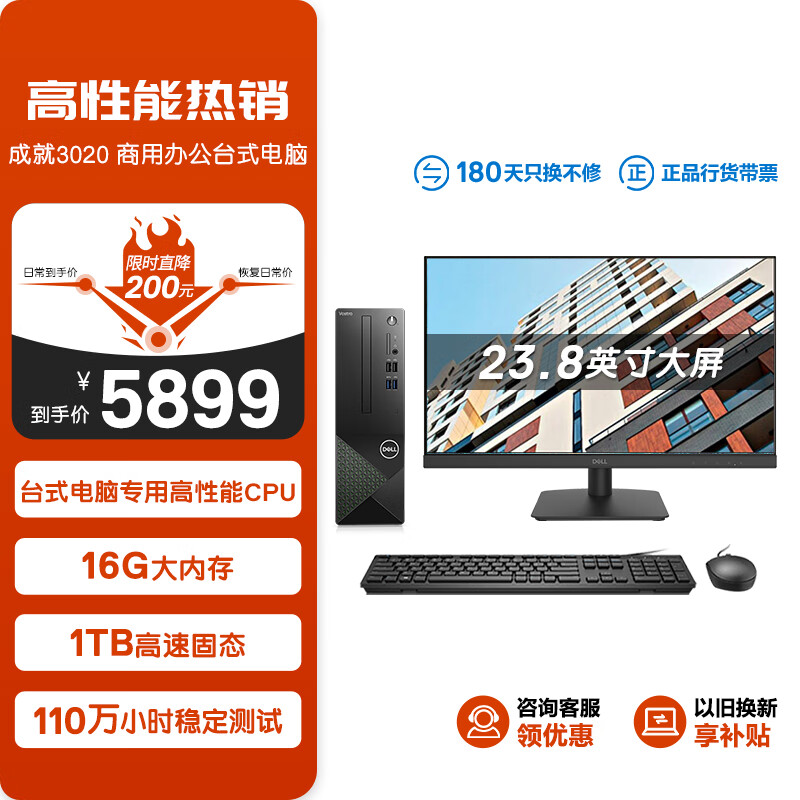 戴尔(Dell)成就3020 台式电脑主机(酷睿13代i7-13700 16G 1TBSSD)23.8英寸大屏显示器 高性能CPU价格:5899.00元!