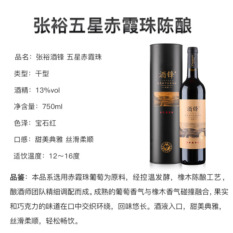 商品名称:张裕张裕酒锋五星陈酿赤霞珠干红葡萄酒750ml*6瓶整箱圆筒装