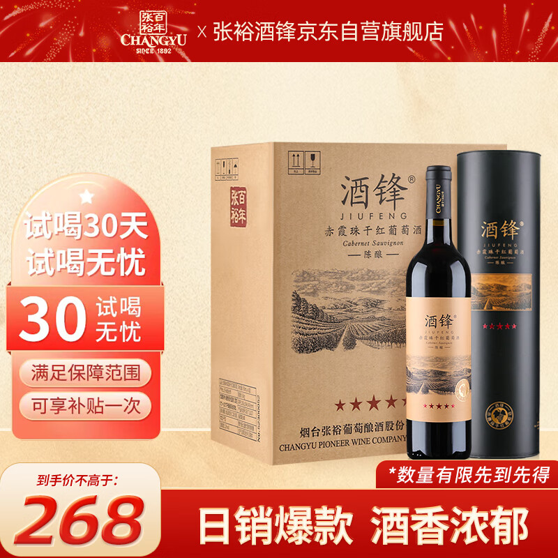 张裕 酒锋 五星陈酿赤霞珠干红葡萄酒 750ml*6瓶 整箱圆筒装 国产红酒价格:268.00元!