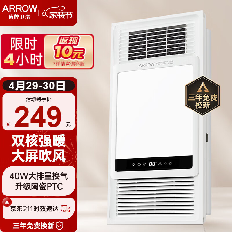 箭牌(ARROW)风暖浴霸 双核浴室取暖器 卫生间排气扇照明一体暖风机 集成吊顶价格:259.00元!