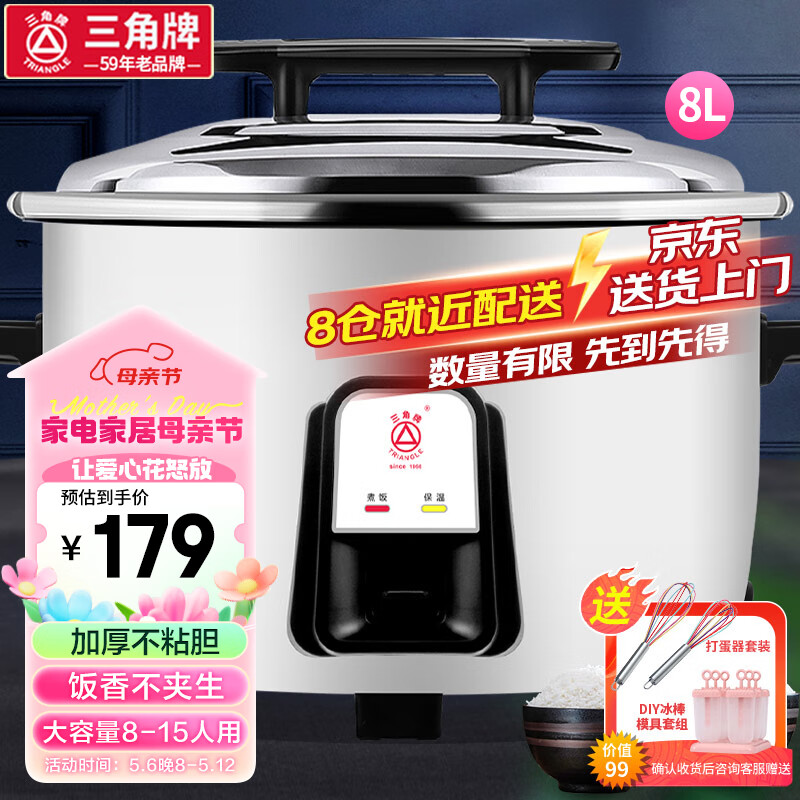 三角牌(Triangle)电饭煲商用电饭煲 老式电饭锅食堂饭店餐厅酒店工厂保温蒸饭锅大容量家用 8L 6-10人用价格:189.00元!