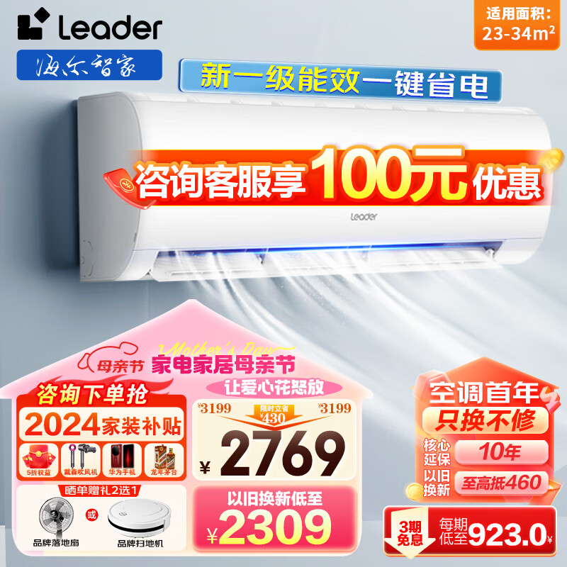 Leader空调海尔出品大2匹壁挂式空调挂机新一级能效变频冷暖WIFI智控速冷大风量自清洁以旧换新50MDA81价格:2899.00元!